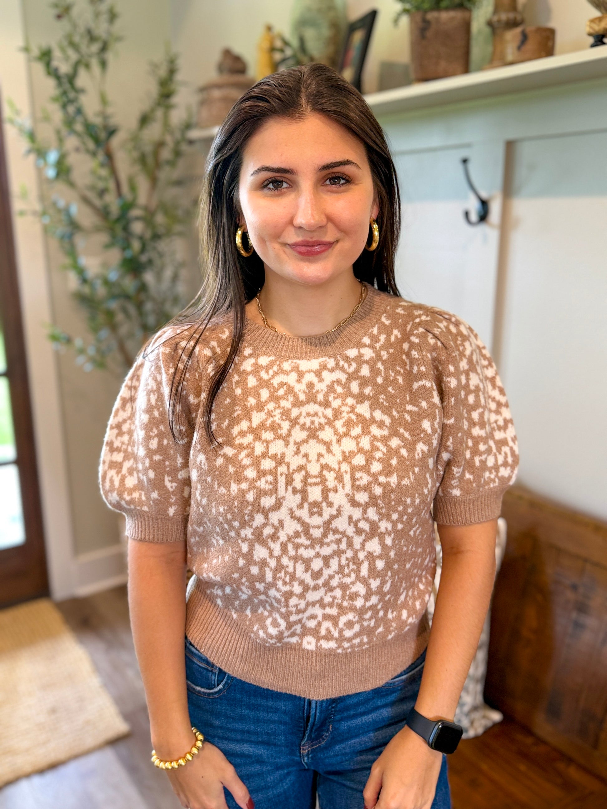 Bring a wild and soft touch to your look with this taupe Animal Pattern Puff Sleeve Sweater. Its playful animal print and short sleeves add fun flair, while the plush fabric keeps you feeling cozy and comfy all day long. Perfect for mixing bold style with everyday softness!
