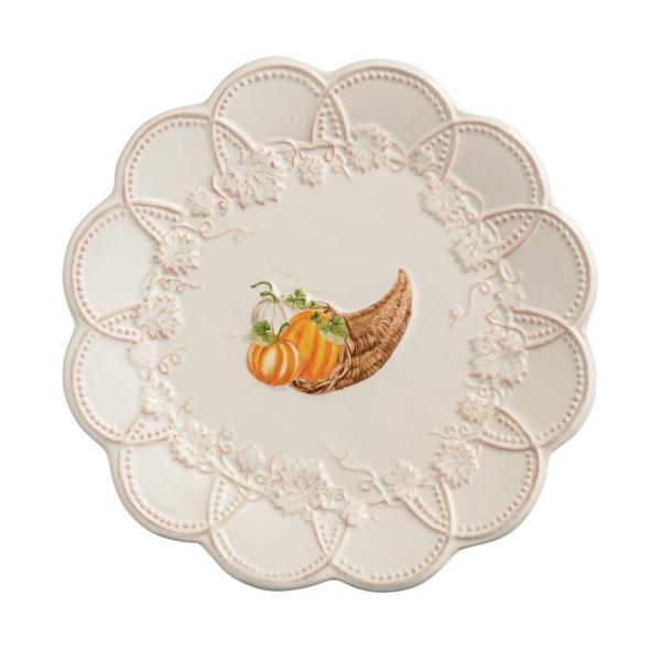 Cornucopia Salad Plate. Crafted from durable stoneware, this elegant salad plate features a charming scallop edge design, adding a touch of sophistication to any table setting. With an 8-inch diameter, it is the perfect size for serving salads, appetizers, or desserts. The high-quality stoneware construction ensures long-lasting use and is both microwave and dishwasher safe for convenience. Ideal for everyday dining or special occasions, this versatile plate complements a variety of tableware styles, making it a must-have addition to your dinnerware collection.