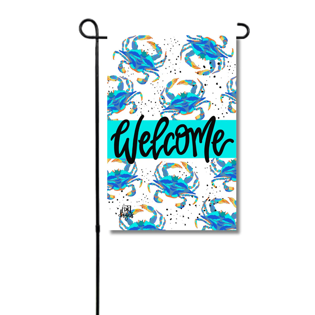 Brighten up your outdoor décor with the Crab Garden Glam! This is not your ordinary garden flag. It’s a glamorous décor piece featuring a group of crabs crawling on the sand and a "Welcome" message.