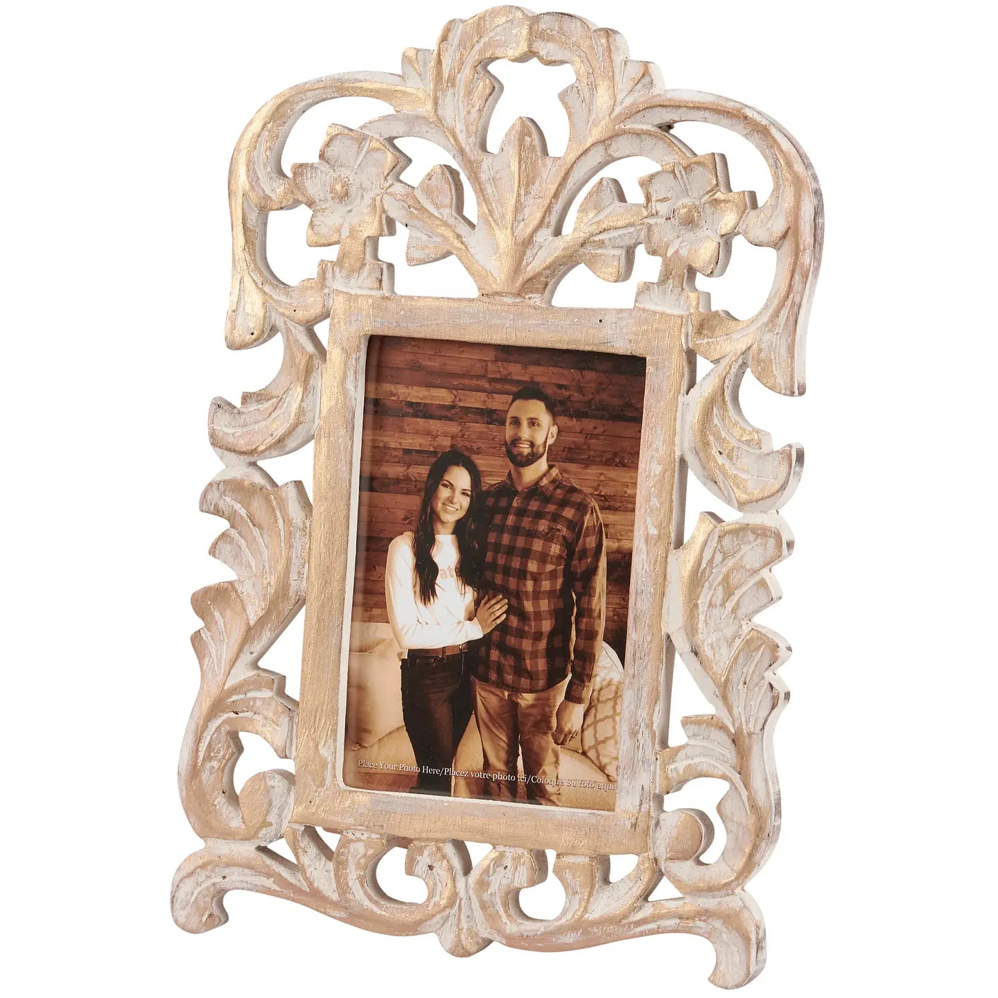 A decorative photo frame from our Vintage Collection displaying a filigree inspired design accented with a metallic gold antique finish. Frame fits a 4 inch by 6 inch photo and can easily be replaced via clips on back. Our Gold Filigree photo frame is easy to display using easel back to free-stand. A vintage style frame perfect for displaying favorite memories as everyday home décor.