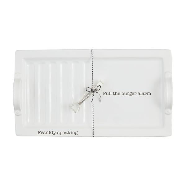 The Burger & Hot Dog Platter Set is a versatile 2-piece collection designed to elevate your dining experience. The ceramic platter is thoughtfully crafted with grooves to securely hold hot dogs, while its flat area is perfect for accommodating burgers, ensuring your food stays in place. Accompanying the platter are elegant stamped silverplate tongs, adding a touch of sophistication to your serving routine. The platter measures 10 inches by 18 inches, providing ample space for your culinary creations, and the tongs are 4 1/2 inches long, offering a comfortable grip for effortless serving. Made from durable dolomite, this set combines functionality with style, making it an ideal choice for both casual gatherings and special occasions.