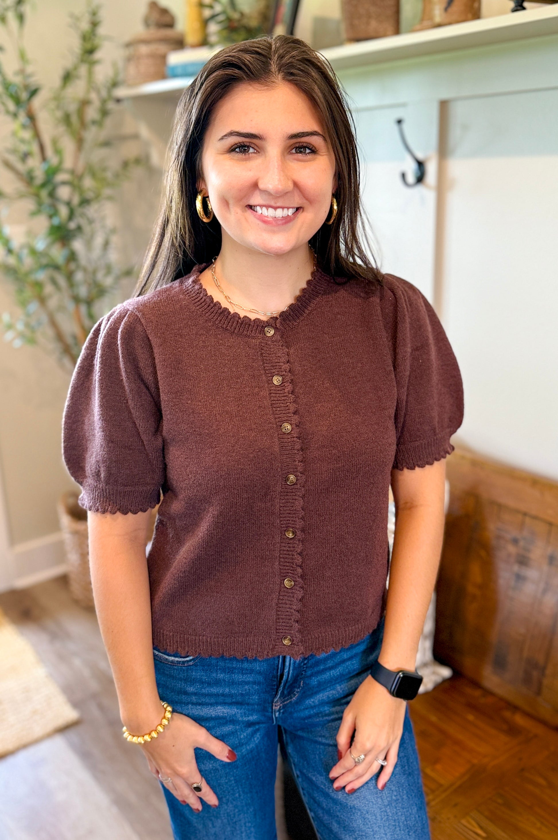 Add a sweet twist to your wardrobe with this chocolate-colored Simple Puff Sleeve Sweater. Featuring charming scallop trim and a button-up front, its short sleeves bring a playful vibe to any outfit. Perfect for sunny days or layering, this sweater blends cozy comfort with a touch of whimsy.