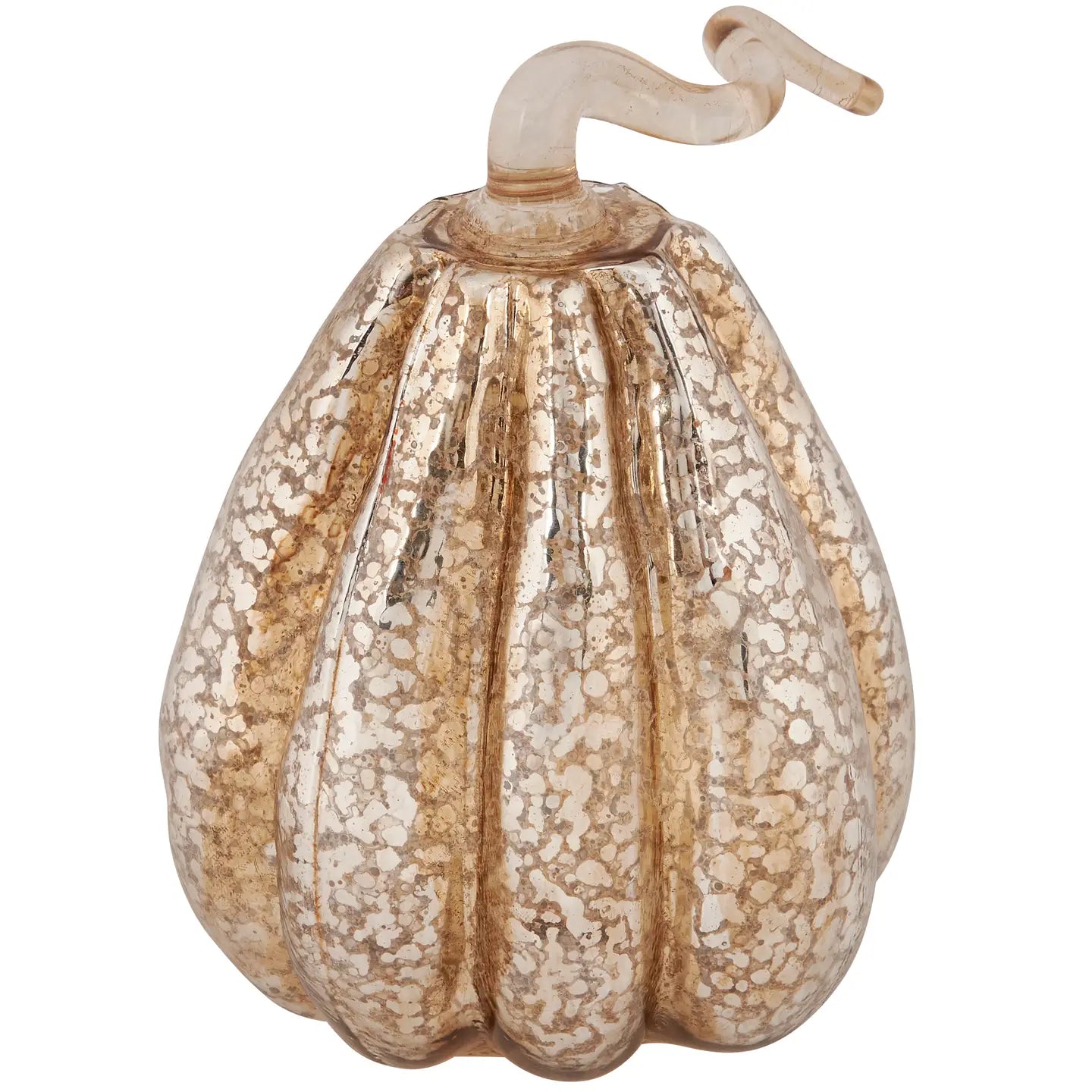 A decorative glass pumpkin from our Fall & Harvest Collection featuring a tall shape and mercury glass inspired finish with coiled glass stem for added interest. Our tall Mercury glass pumpkin is designed to free-stand on any flat surface. Place in a display to add a stylish touch of autumn or with other decorative pumpkins as a collection. A chic home accent with a variety of seasonal display options.